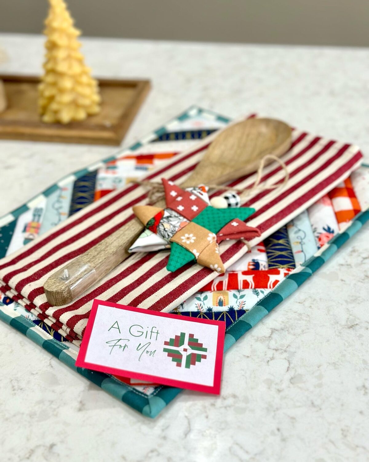 Of course the popular quilted casserole dish sized hot pad is on the list. This can also be made in a few hours, along with a pair of matching hot pads (shown below). Pair it with a nice set of wooden spoons, dish towels, or a new pyrex dish (this one is my favorite) and this makes a great gift!