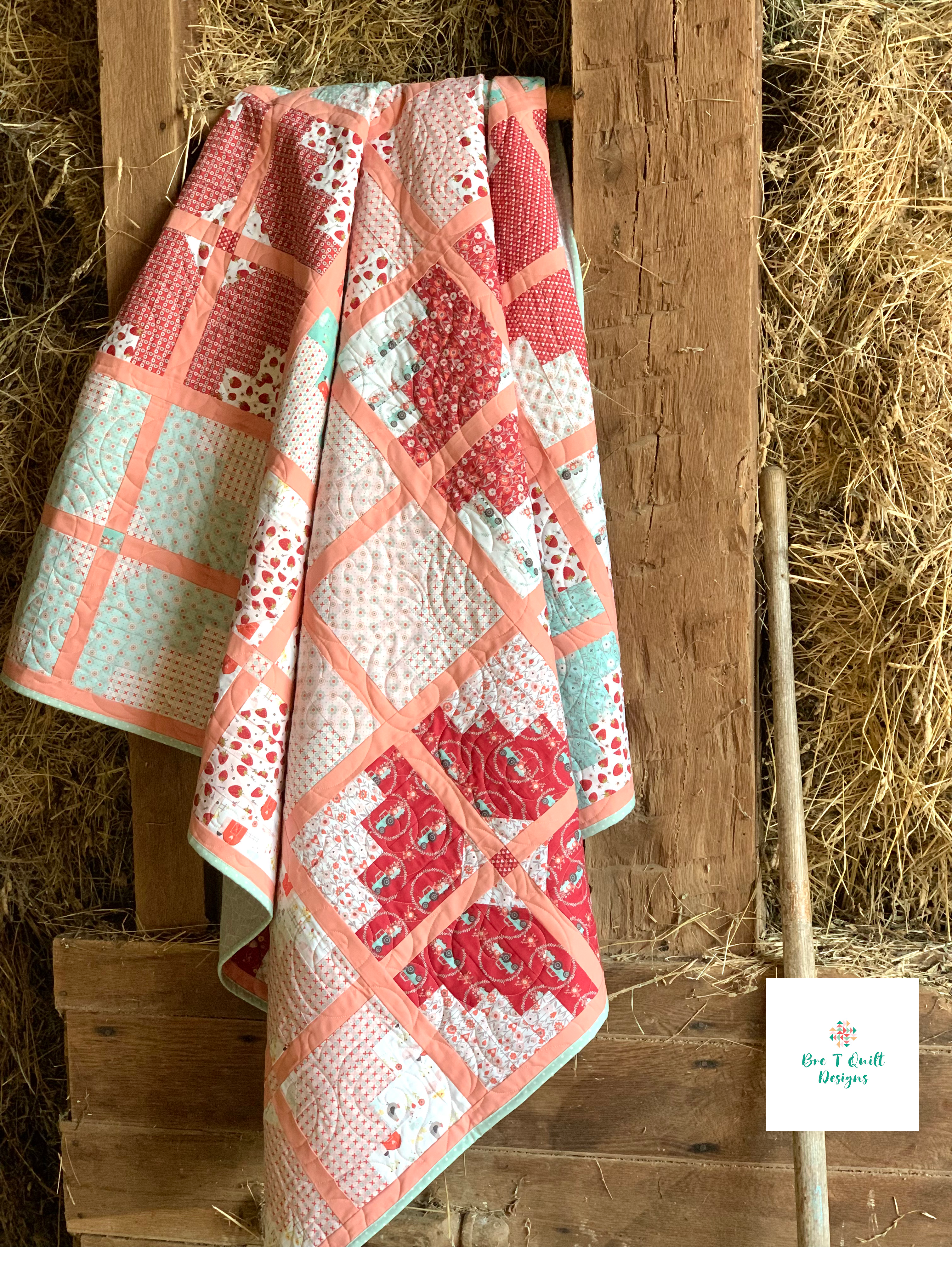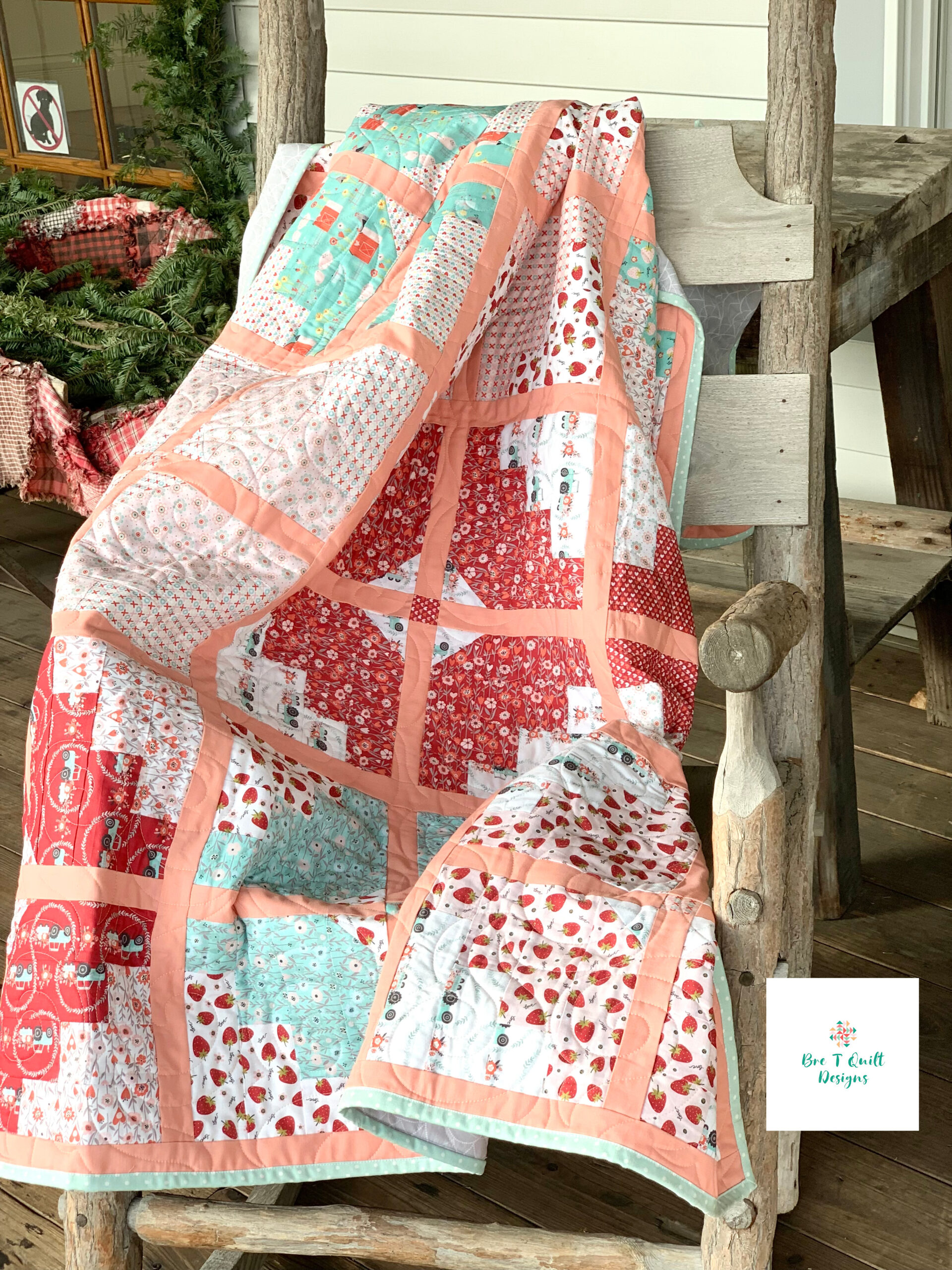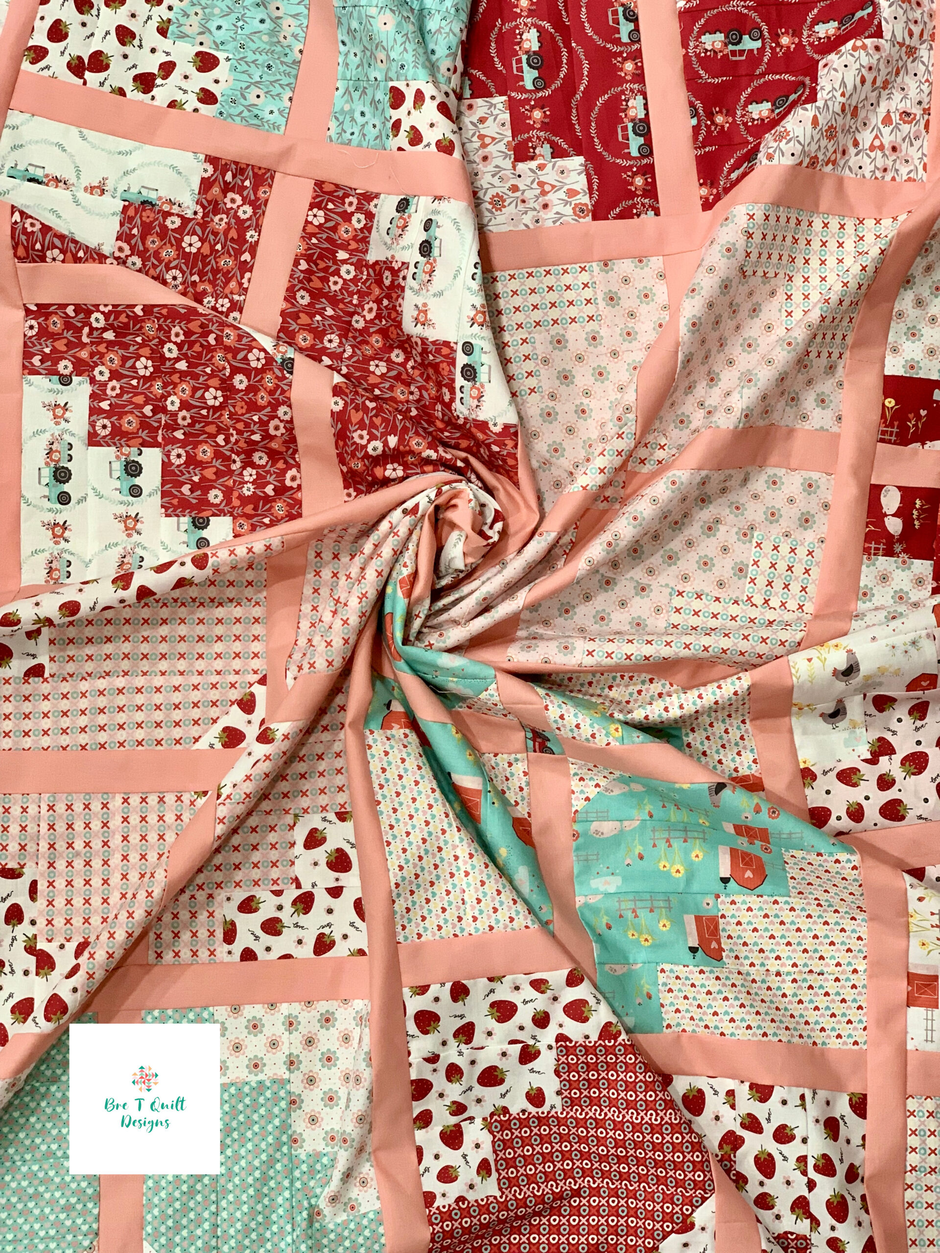 This adorable fabric features little blue tractors, red barns, farm animals, strawberries, and florals. It is seriously the sweetest fabric line! If tractors and farm animals aren’t your thing, you can easily leave out a few fabrics and still have the cutest fabric line. I think this one would also make the perfect Valentine’s Day quilt!