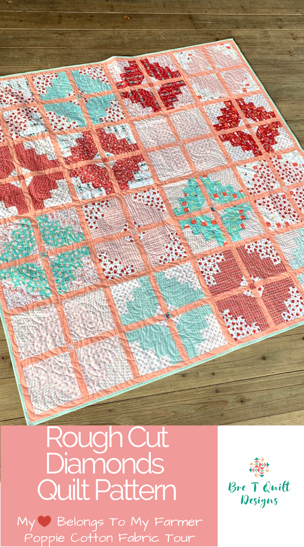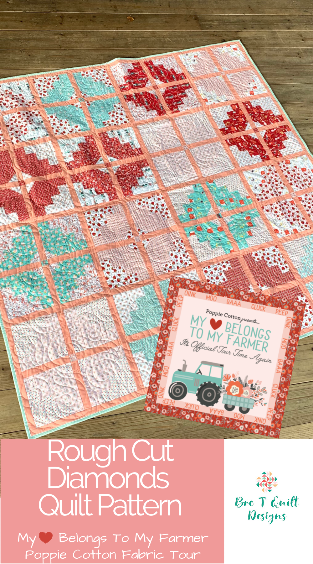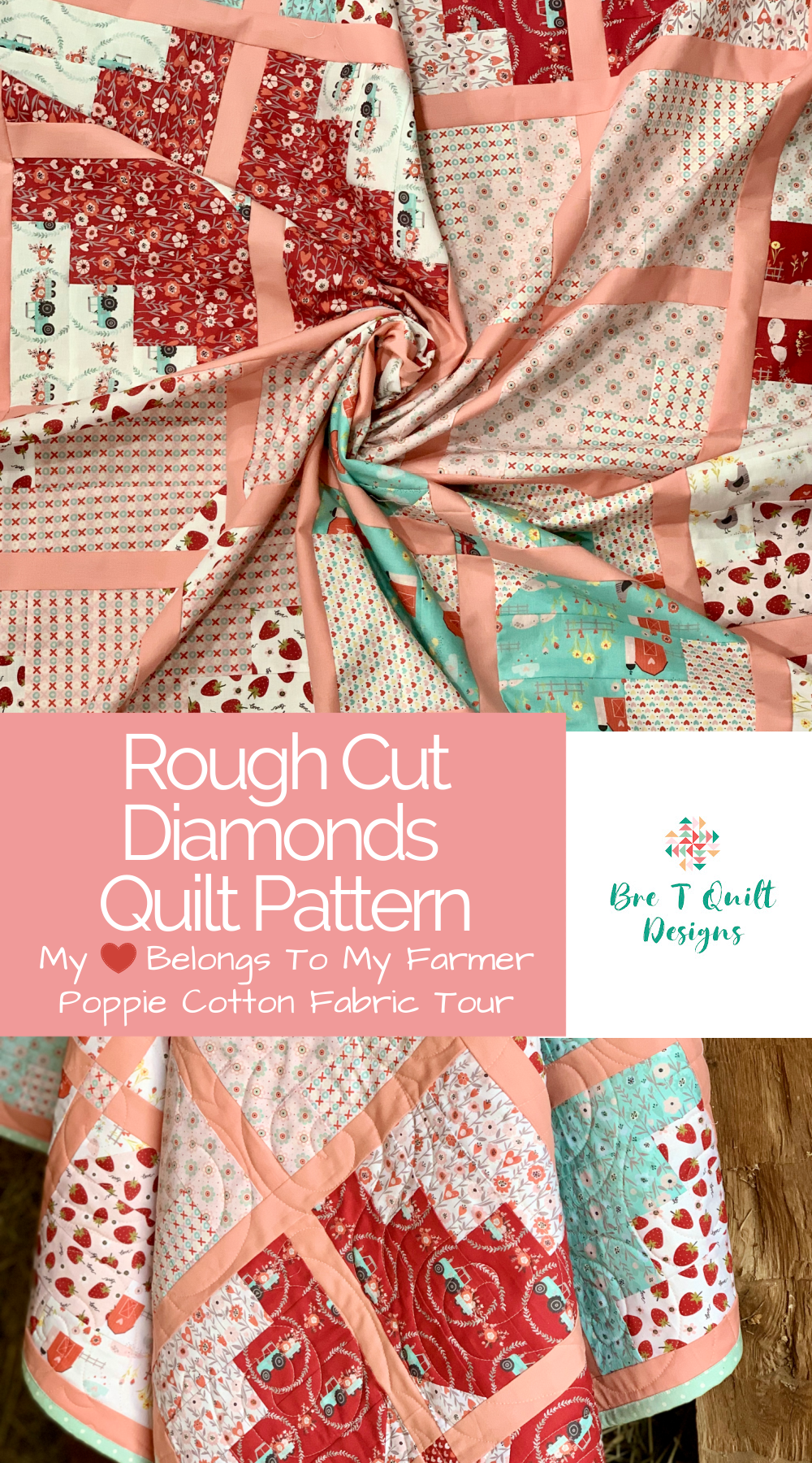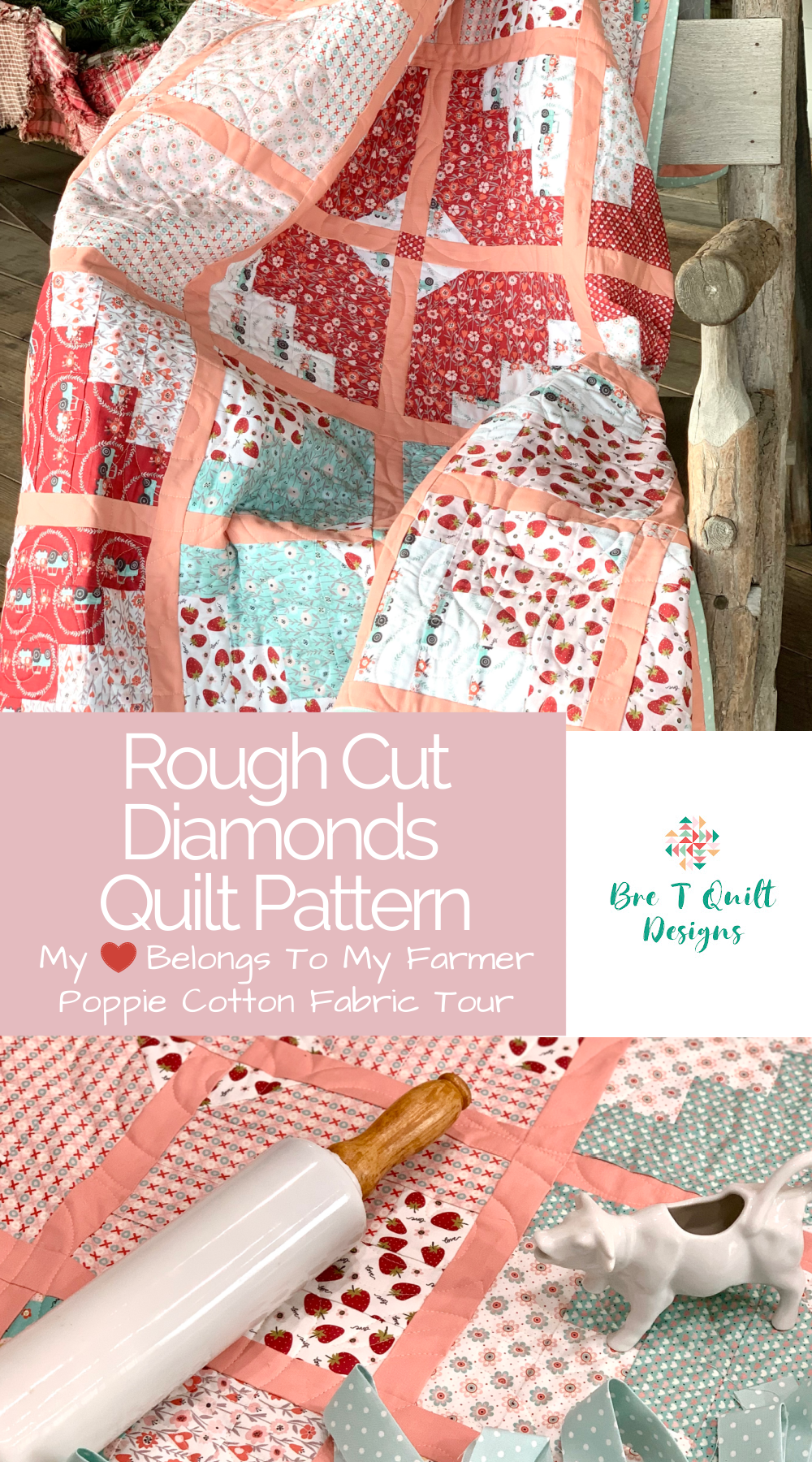 Because there were so many similar colors I thought this line would be adorable in my Rough Cut Diamonds Quilt Pattern, and it did not disappoint! I used a fat quarter bundle and made it scrappy using all of the whites as background colors and the pinks, blues, & reds as interior colors.