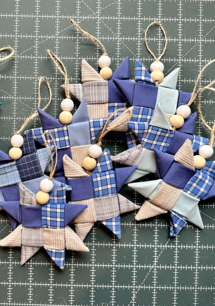 Another idea for you is of the sentimental sort. One year I folded a bunch of these fabric stars using my late grandpa’s woven shirt scraps (after making a quilt of course) and handed them out to my Aunts and Uncles at our family Christmas. Everyone was so appreciative to have a sentimental gift to hang on their tree.